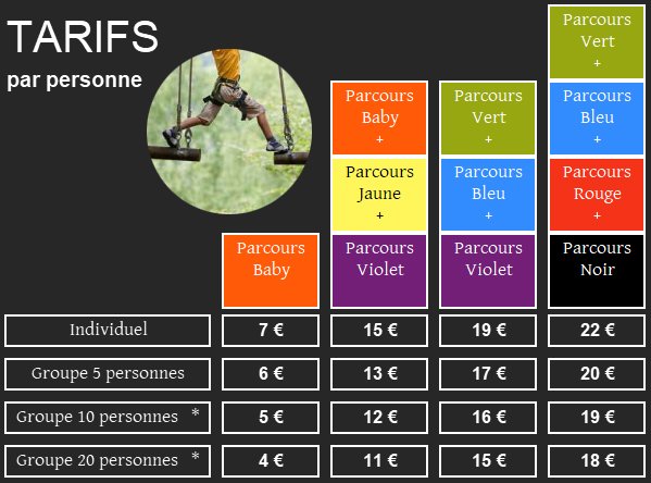 Parcours Baby: A partir de 2 ans (2 heures), Parcours jaune et Parcours violet: à partir d'un mètre 05 (2 heures30), Parcours vert et Parcours bleu: à partir d'un mètre 30 (3 heures), Parcours rouge et Parcours noir: à partir d'un mètre 50 (3heures)